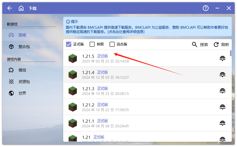 目前本站运行的我的世界服务器版本是"1.21.5",这里可以选择1.21.5的我的世界客户端版本来进行安装。