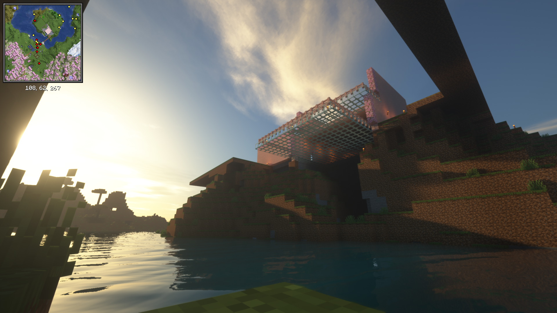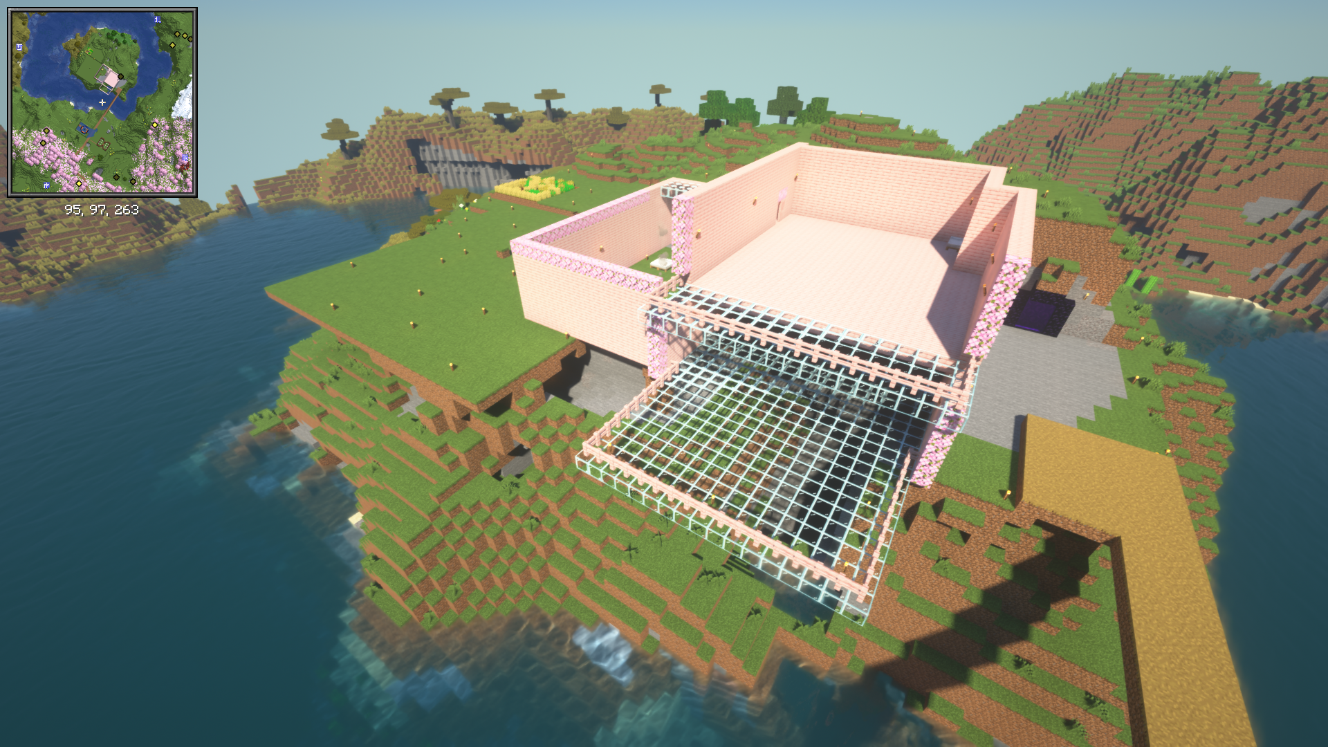 在离出生点不远的小岛上,有着来自一位未知旅行者留下下房子,房子依山而建,其上向外延伸的玻璃阳台瑰丽无比。房子旁还有这一亩良田,其中作物生长繁茂,看得出来这位旅行者在这里生活了很长一段时间,也不知到这位旅行者还会不会回到这里,或者这个世界只是他漫长旅途中的一个小小落脚点,我们或许再也不会等到他的归来....